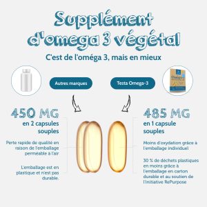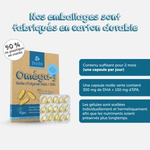 Testa DHA & EPA est un produit oméga-3 complet, idéal pour soutenir la santé globale. Il est également sans sucre, sans allergènes, sans OGM et ne contient pas de substances nocives de l’océan.