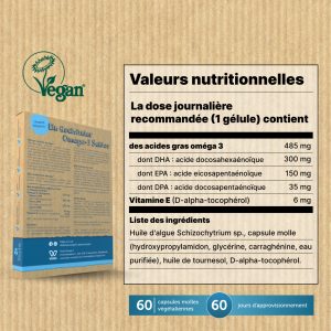 Huile d’algues (Schizochytrium sp.), gélule végane (hydroxypropylamidon, glycérol, carraghénane, eau purifiée), huile de tournesol hautement oléique, d-alfa-tocophérol.