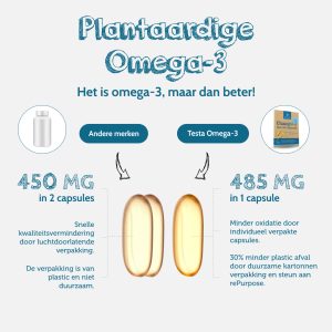 DHA, EPA en DPA zijn essentiële omega-3-vetzuren die traditioneel uit vis gehaald worden. Dat is echter helemaal niet nodig, omdat vissen deze vetzuren binnenkrijgen door het eten van algen. Testa vegan DHA EPA bevat de meest pure essentiële vetzuren, omdat onze vegan omega-3 supplementen rechtstreeks afkomstig zijn uit duurzaam op het land gekweekte algen.